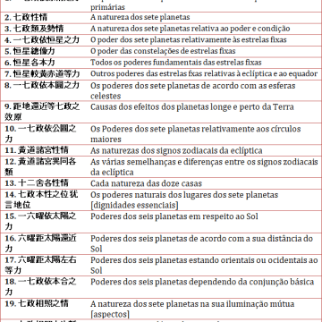 Tabela 1 – Conteúdos do Tianxue shiyong 天學實用 (Pratica da Astrologia)