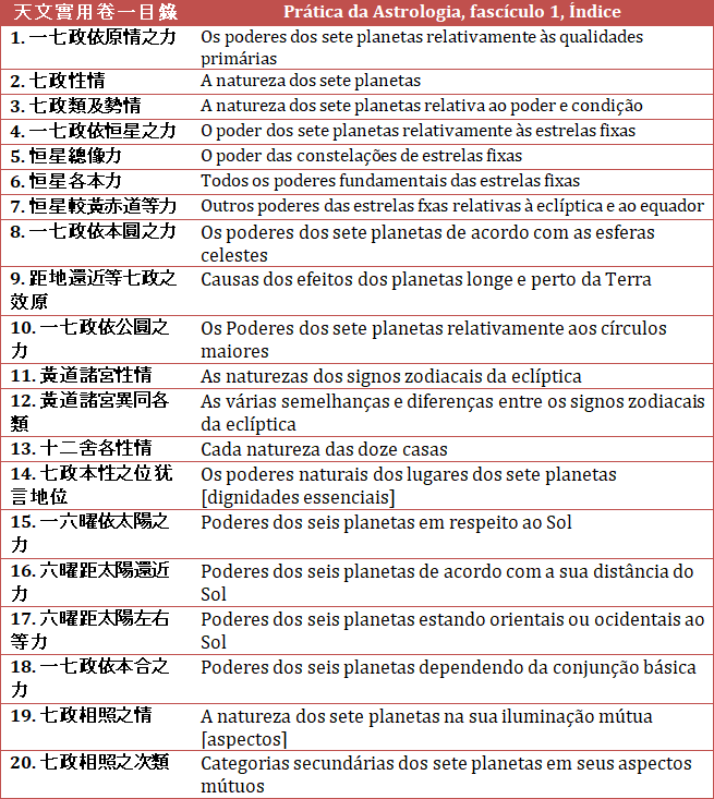 Tabela 1 – Conteúdos do Tianxue shiyong 天學實用 (Pratica da Astrologia)