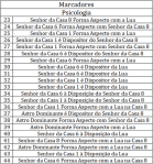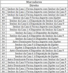 Dentre os marcadores, verificou-se que o de número 1: “Senhor da Casa 1 forma aspecto com senhor da Casa 3” foi o mais frequente nos mapas de profissionais do jornalismo, da mesma forma que o marcador equivalente para profissionais do direito, o de número 45: “Senhor da Casa 1 forma aspecto com senhor da Casa 9”. O marcador equivalente para psicólogo, o de número 27: “Senhor da Casa 1 forma aspecto com senhor da Casa 8” foi o quinto mais frequente na categoria profissional, sendo o mais prevalente o marcador de número 23: “Senhor da Casa 8 forma aspecto com a lua”. Curiosamente estes marcadores foram os que estiveram associados como exclusivos ou com alta prevalência nos mapas dos profissionais em suas categorias (Tabela 3).
