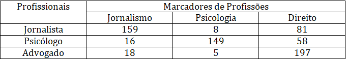Tabela 2. Distribuição das marcas encontradas nos profissionais do jornalismo, da psicologia e do direito nos grupamentos profissionais.