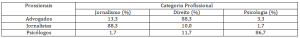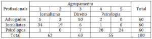 As Tabelas 4 e 5 permitiram evidenciar a distribuição dos profissionais nos diferentes agrupamentos. Observou-se que a maioria dos jornalistas se agrupou na categoria do jornalismo, da mesma forma, os psicólogos na categoria da psicologia e os advogados na do direito.