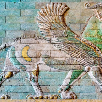 ‘Detail of an enameled brick griffin in one of the friezes of the palace of Darius I in Susa, C. 500 B’