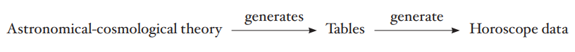 Em breve ofereceremos algumas distinções adicionais para complexificar a seção Tabelas desta imagem, mas por enquanto vamos tratá-la como uma unidade simples e única. Nesta imagem, as tabelas derivam em princípio da teoria astronômica dominante (que é cinemática em sua essência) e os dados horoscópicos derivam das tabelas. Em contraste, na tradição babilônica, estamos perdendo o elemento central fundamental: não há tabelas reais que poderiam ou teriam sido usadas para derivar, pelo menos não diretamente, a maioria dos dados horoscópicos. Para ter certeza, há uma série de ferramentas alternativas que os estudiosos suspeitam que poderiam ter sido usadas para chegar às posições planetárias para uma determinada data – algo forneceu os dados, afinal – mas as posições planetárias não podem ser simplesmente extraídas de tabelas da mesma forma que os modelos cinemáticos permitiram, e a natureza precisa de como isso foi feito ainda é uma questão em aberto.