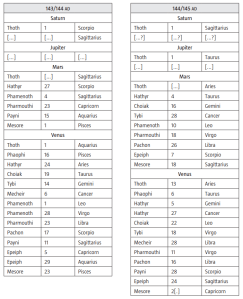Na maioria dos almanaques, cada planeta teria uma entrada para o dia de ano novo Alexandrino, Thoth 1, nos dizendo em que signo o planeta está no início do ano (por algum motivo, algumas dessas entradas estão faltando neste exemplo em particular). Vemos no texto que em 143/144, Saturno começa o ano em Escorpião, mas se move para Sagitário em uma data agora perdida. Lá ele permanece por um bom tempo, ainda em Sagitário no dia de ano novo em 144/145. Se compararmos o movimento de Saturno com o de Marte ou Vênus, vemos o quão mais rápido Marte e Vênus se movem pelos signos. Em 143/144, Vênus atravessa um total de quatorze signos em ordem, de Aquário a Áries e então todo o caminho até Peixes novamente. Marte começa o ano retrogradando de Sagitário para Escorpião em Hathyr 27 antes de prosseguir em movimento direto até Peixes durante o resto do ano. O uso do almanaque é imediatamente sugerido por sua forma e conteúdo: dada uma data de nascimento durante os anos em questão, pode-se simplesmente procurar, diretamente, em que signo cada planeta estava naquela data. Observe que tal almanaque é útil apenas para estabelecer planetas em seus signos, não seus graus precisos nesses signos, embora seja certamente possível que estimativas aproximadas pudessem ter sido feitas para subunidades de signos, como decanos ou termos (isso é especulação da minha parte; não é encontrado em fontes antigas).