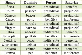 Tabela para saber-se quando as sangrias e purgas serão prejudiciais ou favoráveis e também em que parte do corpo terão domínio os signos e planetas.
