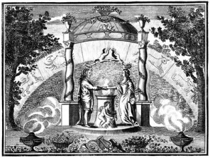 La balanza y el reloj de arena, serían símbolos de Saturno. Este planeta está asociado, en alquimia, al color negro (nigredo), y al plomo, el metal utilizado inicialmente por los alquimistas. Hay también una rueda de molino, símbolo de la «vía seca», uno de los métodos para la obtención de la Gran Obra, y también emblema de la putrefacción.