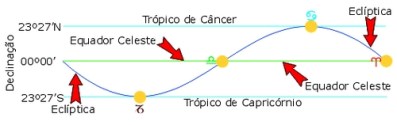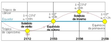 Já a tabela abaixo mostra as coordenadas equatoriais do Sol nos equinócios e solstícios.