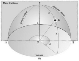 A figura I.1.1 abaixo ilustra o sistema de coordenadas horizontais. Na figura vemos a metade da Abóbada Celeste (= Esfera Celeste) visível ao observador situado em O. A posição da estrela está marcada por E. O Zênite do observador é indicado por Z. O zênite é o ponto da esfera celeste acima da cabeça do observador. De maneira mais técnica podemos defini-lo como sendo o ponto da esfera celeste que resulta da extensão ad infinitum da vertical do observador. Assim sendo, a direção de Z é perpendicular ao Plano Horizontal do observador, no qual se situam os pontos cardeais: Norte (N), Leste (E), Sul (S) e Oeste (W).
