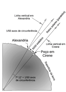 Ele notou que no dia do solstício de verão os raios solares atingiam o fundo de um poço em Siena (atual Assuan, no Egito) ao meio dia. No mesmo instante, contudo, o Sol não estava exatamente no zênite na cidade de Alexandria, a norte de Siena; pelo tamanho da sombra que o Sol projetava, Erastóstenes determinou o ângulo de incidência dos raios solares: 7° 12’, correspondendo a 1/50 de um círculo. Conhecido o arco de circunferência entre as duas cidades, ou seja, a distância entre elas, Erastóstenes pode então estimar a circunferência do globo. A distância era de umas 500 milhas (na direção norte–sul). Se essa distância corresponde a 1/50 da circunferência da Terra, esta deveria ter então 50 x 500 = 25.000 milhas de circunferência. Este é um valor bastante próximo do raio equatorial terrestre (24.901 milhas, valor adotado no World Geodetic System). A figura I.1.12 ilustra o método usado por Erastóstenes. Nela vemos raios solares paralelos incidindo sobre as duas cidades, sendo que em Alexandria o ângulo com relação à vertical não é nulo, mas de 7°12’.