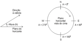 Pois bem, podemos situar qualquer ponto na esfera celeste com duas coordenadas. No caso do sistema horizontal essas coordenadas são a altura h e o azimute A. Pela figura I.I.1 vemos que a altura é o ângulo entre a direção à estrela (segmento de reta OE) e o plano do horizonte. A altura é arbitrada como sendo positiva para pontos da esfera celeste situados acima do horizonte e negativa para aqueles abaixo do horizonte. Já o azimute é o ângulo, contado ao longo do plano horizontal, entre o plano meridiano e o vertical da estrela. A origem da contagem de A (ou seja, A = 0°) é em geral arbitrada como sendo o ponto cardeal norte (N); mas alguns autores preferem usar o ponto cardeal Sul (S). É comum também se substituir a altura h pela distância zenital z; esta última é o ângulo entre a direção vertical (ou seja, OZ) e a direção à estrela. Fica claro, tanto pelas definições quanto pela figura, que a altura e a distância zenital são ângulos complementares, ou seja: