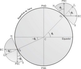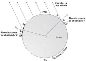 Além de variar com o tempo, as coordenadas horizontais de uma fonte astronômica também dependem da posição do observador na superfície da Terra. O fato de esta última ser de tamanho desprezível comparada com as distâncias às fontes astronômicas implica que a direção à fonte no espaço independe da posição do observador. Por outro lado, a direção da vertical do observador claramente depende de onde na superfície da Terra ele está. A situação é retratada na figura I.1.4, que mostra dois observadores situados em um mesmo meridiano geográfico, mas em pontos distintos da superfície da Terra. A direção à estrela é a mesma independentemente do ponto de observação sobre a Terra, sendo esta direção representada pelas retas paralelas da figura. Mas as verticais dos observadores, que pode ser aproximada como a reta originada no centro da Terra e que passa pelo observador, aponta em direções diferentes. Em outras palavras, os zênites Z1 e Z2 dos observadores claramente correspondem a direções distintas no espaço. O plano horizontal de cada observador é perpendicular à vertical e, portanto também varia de orientação no espaço. Nota-se que a altura da estrela medida pelo observador O1 é bem menor do que aquela medida por O2. Na figura, PNG e PSG correspondem aos polos norte e sul geográficos, respectivamente.