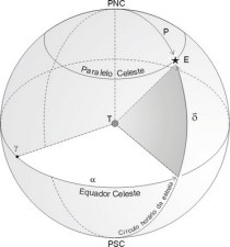 Na figura I.1.6 abaixo vemos uma representação gráfica do sistema equatorial, onde T é o observador e E é uma estrela. Também indicamos a posição do Polo Norte Celeste (PNC). O plano perpendicular à direção deste último e que contém o observador é o plano equatorial. A intersecção entre o plano equatorial e a esfera celeste é o grande círculo chamado de Equador Celeste.