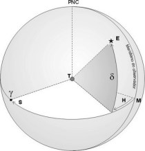 A declinação δ é definida como o ângulo entre o plano equatorial e a direção à estrela (segmento TE da figura). Analogamente ao caso horizontal, o sinal de δ caracteriza os pontos dos diferentes hemisférios separados pelo plano de referência: δ > 0° (δ < 0°) corresponde a pontos a norte (sul) do equador celeste. Uma estrela sobre o equador celeste tem declinação δ = 0°. Já o conjunto de todos os pontos cuja declinação é constante é chamado de Paralelo Celeste ou Paralelo de Declinação. O complemento da declinação, representado pelo ângulo p na figura, se chama Distância Polar, sendo, como implica o próprio termo, o ângulo entre a direção à estrela e a direção ao polo norte celeste (segmento de reta T–PNC). A distância polar desempenha, no sistema equatorial, o mesmo papel que a distância zenital no caso das coordenadas horizontais. Podemos então escrever: