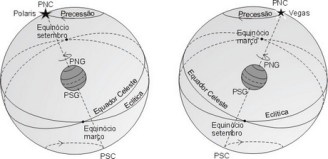 Vemos pelas fórmulas acima que a precessão do eixo é muito lenta. De maneira aproximada, a variação de α é da ordem de 3s por ano e a de δ de uns 20” por ano. A figura I.4.1 mostra a variação da posição dos polos celestes devida à precessão. O painel da esquerda mostra a situação no presente, em que o polo norte celeste coincide aproximadamente com a estrela Polaris. Daqui a milhares de anos, o polo celeste coincidirá aproximadamente com a estrela Vega (painel da direita).