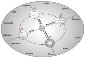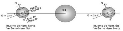 As estações do ano resultam do fato de que o eixo de rotação da Terra está inclinado por uns 23,5° com relação à normal ao seu plano orbital (plano da eclíptica). A este ângulo chamamos de obliquidade da eclíptica, sendo comumente representado pela letra grega épsilon (ε). O eixo aponta sempre na mesma direção no espaço (exceto pelos efeitos secundários de precessão e nutação, que discutiremos mais adiante), de forma que o polo norte geográfico está por vezes inclinado na direção do Sol (de junho a agosto) e por vezes na direção oposta (de dezembro a março). Estas duas situações, obviamente, caracterizam o inverno e verão no Hemisfério Sul da Terra, sendo a situação inversa no Hemisfério Norte.