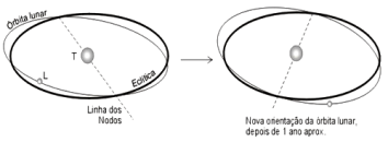 A linha que conecta os dois pontos de intersecção entre o plano da eclíptica e a órbita da Lua é chamada de linha dos nodos. Somente quando a linha dos nodos aponta na direção do Sol podem ocorrer eclipses. Há, portanto, duas épocas ao longo do ano em que podem ocorrer eclipses. Estas épocas mudam com o tempo devido às perturbações gravitacionais sofridas pela órbita da Lua. A linha dos nodos orbitais da Lua varre um ângulo de 360º em um período de 18,6 anos (chamado de ciclo de Saros). A figura I.3.4 ilustra este movimento da linha dos nodos orbitais da Lua. O painel da esquerda mostra a órbita da Lua projetada no céu, juntamente com a eclíptica, num determinado instante. O painel da direita representa a posição relativa dos dois grandes círculos aproximadamente 1 ano depois, tendo a órbita lunar mudado de orientação com relação à eclíptica, o mesmo naturalmente ocorrendo com a linha dos nodos.