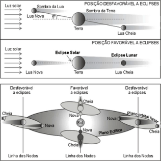 Já a painel inferior da figura I.3.6 combina os elementos orbitais e o jogo de sombras para mostrar a situação favorável à ocorrência de eclipses. A linha dos nodos orbitais da Lua é a linha vertical que corta o centro da figura. Ao longo dela vemos que as fases nova e cheia da Lua acarretam eclipses. Já quando o Sol está fora da linha dos nodos (situações mostradas nas partes à esquerda e à direita da figura), as fases nova e cheia não levam aos eclipses, pois o cone de sombra da Lua (da Terra) não é projetado sobre a Terra (a Lua).