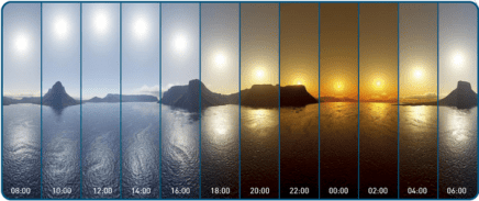 Podemos também usar o ângulo horário do Sol como indicador da hora. Uma vantagem óbvia de fazê-lo reside no fato de que o Sol é facilmente localizável no céu, o mesmo não se aplicando ao ponto vernal. A Hora Solar (M) é então dada pela expressão: