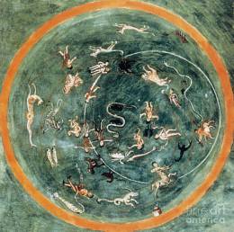 En la época en la que se encuaderna el manuscrito de Orleans que citábamos al principio, seguramente a finales del siglo XIII, el uso de las complicaciones de cómputo monásticas y los planisferios celestes que las adornaban habían pasado de moda, y por ello el incompleto planisferio de Orleans sería desechaco por carecer de interés. Con la creación de las universidades se comenzaría a utilizar manuales como el de Juan de Sacrobosco que haría innecesarias las compilaciones computísticas. Si a ello le sumamos la invención del reloj de escape mecánico a finales de siglo XIII, el interés de estos manuscritos en relación con el tiempo monástico declinaría definitivamente. Los mapas celestes quedarían así pasados de moda hasta que en el siglo XV se descubriera en Sicilia un manuscrito de la Aratea de Germánico con la ilustración de un planisferio celeste. Este mapa “siciliano” del cielo, hoy perdido, se copiaría se copiaría en diversas ocasiones (fig.15), pero sin atención alguna a la posición precisa de las constelaciones, lo que se explica porque el público del siglo XV no estaba ya interesado en las connotaciones computísticas de la posición de las estrellas en el cielo, sino que contemplaba estos mapas celestes como apreciadas reliquias de las imágenes paganas de la Antigüedad.