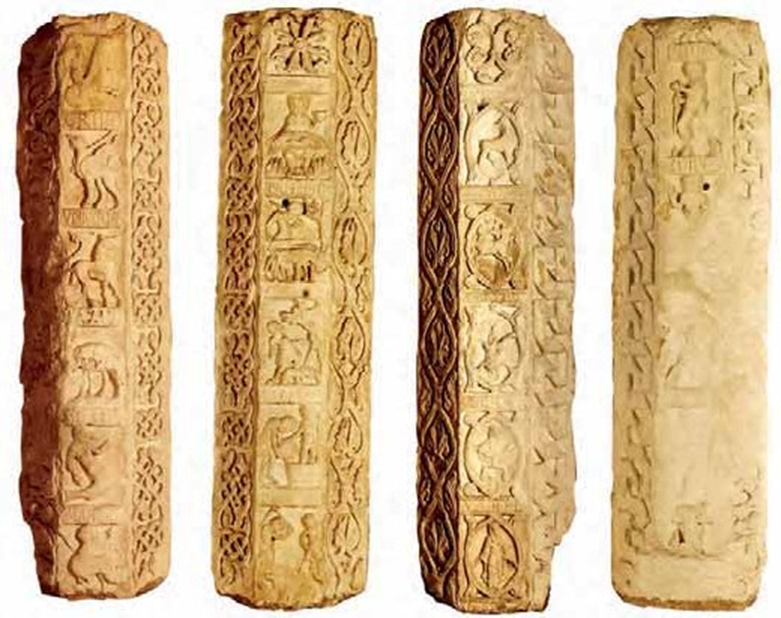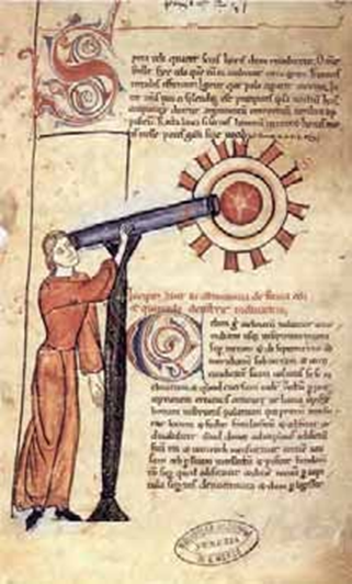 En el citado manuscrito no se detalla el lugar desde el que deben hacerse las observaciones astronómicas, lo que parece apuntar a que se trataría de un lugar obvio, de sobra conocido por la comunidad monástica. Se ha apuntado la posibilidad de que un pilar románico de Souvigny (conservado sólo en parte: aproximadamente la mitad de lo que debió de ser su altura) tuviera por objeto marcar el lugar desde el que se realizaban las observaciones astronómicas en el monasterio (fig.8), pero salvo porque se trata de un pilar exento que podría marcar un sitio relevante del monasterio, su programa no contiene referencias explícitas a la astronomía, con excepción de las constelaciones del zodíaco, que en el románico poseían un carácter cosmológico. Junto a ellas, las representaciones del mensario, animales fantásticos y seres fabulosos hacen pensar más bien en un programa evangelizador como el de la Magdalena de Vézelay, en el que los apóstoles difunden el Cristianismo por todos los rincones del mundo después de Pentecostés. Tenemos, no obstante, la fortuna, de contar con una pieza románica sobre cuyo uso para marcar el lugar desde el que se realizaban observaciones astronómicas en el monasterio hay pocas dudas (fig.9). Sin duda este pilar procedente del monasterio de St. Emmeran, hay que vincularlo a la figura de Guillermo de Hirsau (c.1030-1091), que profesó en St. Emmeran antes de ser abad de Hirsau, ya que contiene un diagrama astronómico (spera) ideado por este monje, que se puede ver también en un manuscrito conservado en Múnich (Manuscrito CLM 14689). Este poco conocido monumento consiste en un pilar sobre cuyo capitel se sitúa la figura de un hombre escrutando el firmamento con ayuda de algún instrumento astronómico. La inscripción identifica al observador como Arato, el poeta griego que se había convertido en epónimo de la astronomía, y sobre los posibles instrumentos, lo más plausible es que fuese un astrolabio o un tubo de observación astronómica. En diversos manuscritos de los siglos XII y XIII aparecen estos instrumentos, como en la miniatura que abre el salterio de Blanca de Castilla o en una imagen de Euclides con un tubo y una esfera armilar junto al monje astrónomo del siglo XII Hermann de Reichenau, conocido por su tratado sobre el uso del astrolabio. En varios manuscritos románicos aparecen monjes mirando a las estrellas a través de tubos de este tipo (fig.11), incluso apoyados en una peana, como en un manuscrito de la Biblioteca Marziana de Venecia (fig.12). En otras obras, el astrónomo observa el cosmos con la ayuda de un astrolabio, como en un manuscrito de Oxford del siglo XII (Bodley 614, 35v; fig.10), o en una personificación de la astronomía que se halla en un esmalte conservado en el Victoria & Albert Museum, donde el personaje está observando el cielo con un astrolábio, igual que en la misma personificación de la Manécanterie de Lyon.