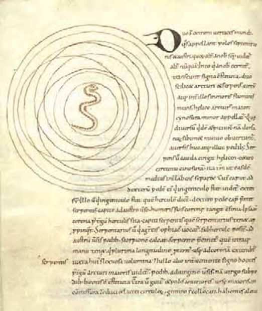 La hoja del manuscrito de Orleans quedó inacabada, -en mi opinión debió de ser copiada en el entorno del monasterio de Fleury en el siglo XI-, y fue encuadernada mucho más tarde como guarda de un conjunto de textos cuya relación con la astronomía es nula. En las bibliotecas monásticas era práctica habitual usar folios estropeados o inútiles como material de encuadernación que protegiera otros textos considerados más valiosos, un modus operandi que conocemos en la biblioteca de Fleury por diversos ejemplos que estudió Elizabeth Pellegrin. Este diagrama del cielo, resultante del intento de proyectar sobre una superficie bidimensional las constelaciones delineadas sobre el globo celeste, no fue el único de esta época que quedó inconcluso, sin duda por la dificuldad inherente de la precisión necesaria para ubicar las constelaciones en el plano de forma rigurosa. Ello explica el gran número de círculos dibujado en el manuscrito de Burgo de Osma, que en su mayor parte no tienen un carácter astronómico, al contrario que el círculo donde se sitúan las ‘constelaciones zodiacales’, sino que constituyen una mera trama donde situar la posición precisa de cada figura que sería indispensable para un possible uso del diagrama. En el caso del manuscrito de Orleans bien pudo ser esta dificultad de delinear las figuras atendiendo a una posición muy precisa la que hiciera al dibujante descartar finalmente su diseño, pero es plausible que fuera el abandono de su función originaria lo que llevara finalmente a considerarlo material de desecho. Tal dificultad en delinear con precisión los perfiles de las constelaciones y eventualmente señalar en ellos las estrellas que los conforman, se hace aún más patente en un planisferio celeste apenas esbozado copiado en Baviera en el siglo XI durante el mandato del abad Ellinger de Tegernsee (975/-¿1056) y conservado ahora en Austin (Texas), (fig.3), donde sólo los círculos de la trama astronómica y la figura de Draco que se situá en el centro fueron dibujados. Al contrario que las dos ilustraciones que hemos visto ya, este mapa del cielo no iba a ocupar una página completa, sino que pretendía ser una mera inicial del manuscrito, lo que sin duda incrementaba sustancialmente las complicaciones derivadas de la precisión exigida y al tiempo disminuía las posibilidades de que pudiese tener ninguna utilidad práctica, puesto que el pequeño formato de las constelaciones haría casi incomprensible la percepción de sus posiciones relativas.