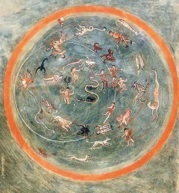 La forma circular del cielo -expresión de la perfección de la obra divina- contiene los signos correspondientes y constelaciones. El nombre de esta forma proviene de los términos «zoe» (vida) y «diakos» (rueda). «El principio elemental de esta «rueda de la vida» se halla en el Ouroboros, o serpiente que se muerde la cola, símbolo de Aion (duración)».