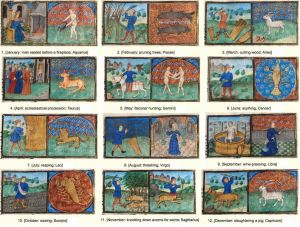 Desde la segunda mitad del siglo XIV y en el XV (Breviario de Belleville de Jean Pucelle, 1323-1326, París, BnF. lat. 10483; Ricas Horas del Duque de Berry, Chantilly, Musée Condé, nº 1284), los calendarios se enriquecerán con escenas más amplias, pobladas de personajes, en las que, junto al trabajo del campo, se incluirá una exaltación de la refinada vida nobiliar y caballeresca de fines del Gótico.