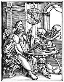22 Salaya, Sancho, Repertorio de los tiempos, Valladolid, Francisco Fernández, 1552; el monje astrónomo rodeado de otros cuatro antecesores contempla una esfera armilar com el zodiaco; en Vindel, F., Manual gráfico-descriptivo del bibliófilo hispano-americano (1475-1850), 1930, n.° 2677. Una de las ilustraciones más bonitas del astrólogo en su oficio es la del folleto de Giogio Tannsteter, ludicium astronomicum viennense anni MDXVI, (Viena 1516); comprado por Fernando Colón en Roma, julio de 1516 (Sevilla, Biblioteca Capitular y Colombina), ver: Reyes y Mecenas, Toledo, 1992, n° 107.