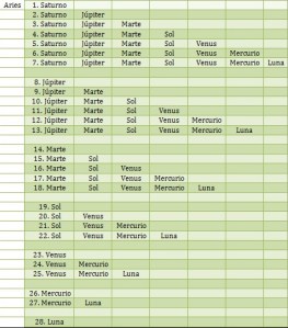 Este esquema se repite para los tres siguientes signos zodiacales y Llull parece creer que desarrolla todos los casos posibles ya que señala que “Cascú signe ab les planetas à en lo sel XXVIII conjuncions e cascune a son judici”.