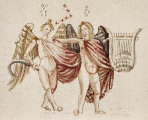 Esta tradición occidental a la que nos referimos halla su origen remoto en las ilustraciones de ciertos tratados mitopoéticos de astrología que se copiaron profusamente en época carolíngia. Entre los más frecuentemente copiados se hallan las distintas versiones de los Phaenomena de Arato. A una de estas versiones, la de Germánico, se añadieron con frecuencia comentarios relacionados con distintas secciones de la obra, y entre éstos se hallan los que Breysig denominó Scholia Strozziana. Las ilustraciones de este texto poseen algunas características peculiares en rélación a otras derivadas de la obra de Germánico: éste es el caso de las constelaciones Hércules, Andrómeda y Auriga, cuyos caracteres mitológicos se acusan más que en manuscritos como el bien conocido Voss. Lat. Q. 79 de la biblioteca universitaria de Leiden Ala familia de los Scholia Strozziana pertenece un manuscrito del siglo XII que frecuentemente se ha relacionado con Ripoll: el códice 19 de la Biblioteca Nacional de Madrid. Lo que nos interesa a este respecto es que fue un ejemplar de este tipo de manuscritos el que se utilizó para las ilustraciones de un texto que marca el siguiente jalón en este apresurado recorrido por la tradición medieval de las figuras astrológicas que centran nuestra atención. Nos estamos refiriendo al Liber introductorius de Miguel Escoto, el astrólogo de Federico II. En efecto, los manuscritos que conocemos, los más tempranos de los cuales no parecen ser anteriores al siglo XIV, muestran una iconografía tomada de un manuscrito perdido, conocido como “el manuscrito siciliano”, que contenía el texto de Germánico los Scholia Strouinna, con unas miniaturas similares al citado manuscrito de la Biblioteca Nacional de Madrid.