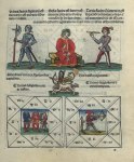 No obstante, dadas las divergencias expuestas, merecerá la pena apuntar la posibilidad de otras opciones al recurso de considerar una ineluctable relación modelo-copia; por otro lado, cuesta pensar que en una Universidad que contaba con una cátedra de astrología desde hacía décadas se asumiera de forma acrítica un modelo recién llegado de Italia. Para poner de relieve las divergencias citadas, así como las similitudes, proporcionamos en apéndice una comparación entre las pinturas de Fernando Gallego y las distintas ediciones ilustradas del texto de Higino en la década de 1480. La inversión de determinadas figuras, la adocenada ejecución de otras, la desaparición de ciertos atributos que se observa en unas ediciones respecto a otras, no resuelven todos los problemas planteados, y por ello, para terminar, abandonaremos el campo de la ilustración en grabado para detenemos en algún manuscrito que indirectamente pudiera ser relevante para nuestros intereses.