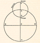 Modelo de la excentricidad de las órbitas de los planetas. El punto E es la Tierra y el punto C es el centro de la órbita del planeta.