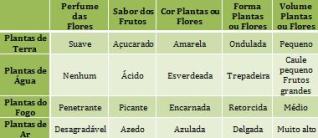 Plantas Lunares: são de folhas grandes ou pequenas, mas abundantes; as flores são brancas ou de cores claras; os frutos são de gosto insípido e sem cheiro e em geral são de aparência bizarra; vivem na água ou bem perto dela; são frias, leitosas, narcóticas e antiafrodisíacas; costumam ser usadas nas práticas de feitiçaria. Exemplos: agrião, erva-pombinha, tília, chapéu-de-couro, bananeira, abóbora, violeta amarela, trevo, margarida, lírio branco.