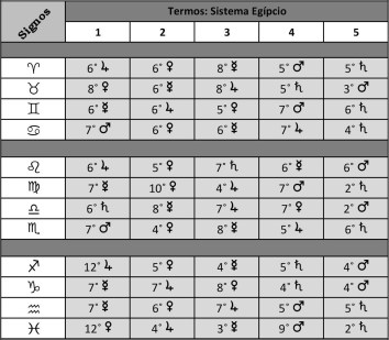 Com relação aos termos, dois sistemas principais estão mais em circulação; o primeiro é egípcio, o qual está baseado primeiramente no governo dos domicílios, e o segundo é caldeu, que se baseia no governo das triplicidades.