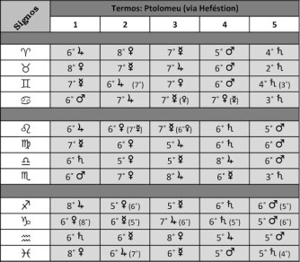 Com relação ao número dos termos, quando não há nenhuma estrela com duas prerrogativas, nem no signo mesmo nem nos que o seguem dentro do quadrante, são concedidos a cada um dos benéficos, ou seja, Júpiter e Vênus, 7º, aos maléficos, Saturno e Marte, 5º cada e a Mercúrio, que é comum 6º, de forma que o total perfaz 30º. Entretanto, uma vez que alguns sempre têm duas prerrogativas, pois Vênus sozinha se torna a regente da triplicidade de Touro, já que a Lua não participa nos termos, é dado a cada um dos planetas nesta condição, seja no mesmo signo ou nos signos seguintes no mesmo quadrante, um grau extra; esses foram marcados com pontos; os graus, no entanto, adicionados por causa da prerrogativa dupla são retirados dos outros, que têm somente uma, e de forma geral, de Saturno e de Júpiter porque eles têm o movimento mais lento.