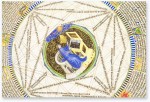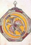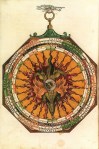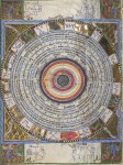 De Sphaera, o trabalho mais importante de Sacrobosco, apareceu pela primeira vez em 1220 e foi usado como um livro de astronomia na Universidade de Paris. Manteve-se o livro de astronomia em toda a Europa para os próximos 450 anos. Esta é uma das muitas cópias manuscritas do trabalho; suas iluminuras de ouro e seu fino veludo tornou o livro demasiado caro para o uso de um aluno. Sua representação do cosmo medieval é característica das ilustrações que persistiram até o século 17. O centro do gráfico mostra o sistema solar em círculos concêntricos e a esfera da Terra rodeada por esferas de água, ar e fogo, e, em seguida, os círculos concêntricos que representam as esferas dos planetas conhecidos e as estrelas fixas. O último círculo concêntrico representa o Primum Mobile ou Mover Prime, ou seja, Deus, Causa Primeira.
