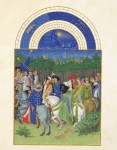 Tanto a corte do duque como os servos da terra estão presentes nas iluminuras, cada ilustração é encimada pelo hemisfério apropriado e pela carruagem solar, pelos signos e graus do zodíaco, pelos dias do mês, assim como referências ao Martirológio Romano.