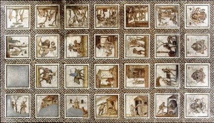 Entre los mosaicos más evidentemente relacionados con esta ordenación mensual de las faenas agrícolas hay que recordar el de «Vienna» (Saint Romain en Gal) conservado en el Museo del Louvre y que data del siglo III. Sin embargo, a diferencia de los menologios propiamente dichos, en él cada operación no se halla presidida por un mes determinado, sino que a cada una de las cuatro estaciones debían corresponder siete recuadros con escenas, de las cuales no se han conservado todas. Las hoy existentes -con arreglo al orden que ahora más nos conviene seguir- se disponen de esta suerte: