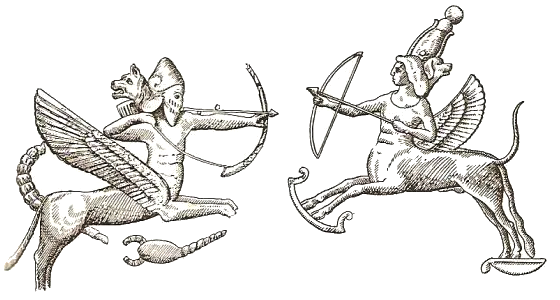 ♐ Sagitário (Arqueiro (קשת), Qašat): Somente nos zodíacos judeus em Beth-Alpha e Ḥusaifa é o Sagitário representado como uma pessoa segurando um arco e flecha em sua mão esquerda. Em todos os outros casos, Sagitário é um centauro, atirando um arco e flecha. Esse retrato pode ser rastreado até a representação babilônica (fig.15). Essa representação é encontrada em Dendera (fig.15) e em relevos romanos. Estes são principalmente dos séculos II e III, em Aion, Atlas apoiado por Júpiter, e também em um relevo de lápide. Existem também relevos de Mitra com cintos zodiacais retratando o arqueiro como um centauro, como no relevo de Dura. O motivo do arqueiro como um centauro também pode ser encontrado em tetos romanos, como o teto de Palmira (fig.8), em pisos de mosaico, como em Tivoli (fig.10), e também no Manuscrito 1291, (fig.13). Em alguns casos, a figura é alada, como no chão de Bir-Chana (fig.9). Em alguns casos, ele está usando uma capa, como no relevo de Atenas e no Calendário 354. A representação de Sagitário como um centauro continua na Idade Média nos zodíacos de vários manuscritos e em outras formas de arte.