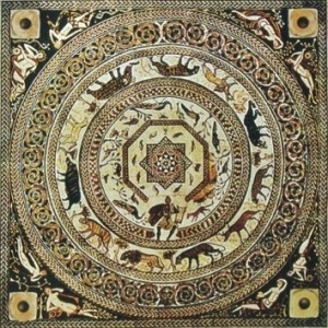 A próxima fase é representada pelo piso de mosaico Münster (fig.10). Lehmann notou que este esquema, originalmente no teto, é projetado aqui no chão. Mais uma vez, o padrão básico ocorre com o ponto focal do desenho no centro. Agora, porém, o deus solar frontal substituiu os sete planetas e, no círculo externo, os signos zodiacais estão divididos em unidades individuais. Em ambos os exemplos (Palmira e Münster), os desenhos dos cantos do quadrado são semelhantes em composição: ambos têm objetos situados diagonalmente nos cantos, com desenhos radiantes preenchendo o restante da área.