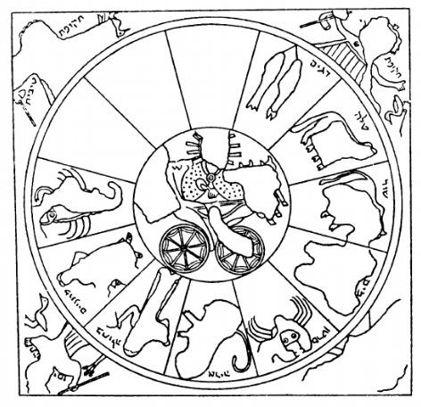 A primeira fase no desenvolvimento do desenho é o teto de Palmira (fig.8), que é o mais antigo adequado para comparação com o zodíaco judeu. O ponto focal do desenho é o círculo central de sete planetas. O círculo externo contém os signos zodiacais em um padrão contínuo e os cantos do quadrado são preenchidos com sereias. Este desenho é comparável ao piso de mosaico Bir-Chana do século III (fig.9), que tem os planetas no centro do desenho em um padrão geométrico semelhante. Ele também tem a moldura externa dos signos zodiacais (essa comparação já foi apontada por Lehmann). No entanto, em vez de formar um padrão contínuo, os signos zodiacais no mosaico de Bir-Chana são enquadrados em unidades separadas.