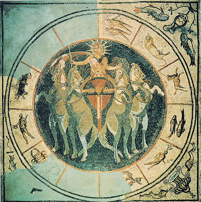 Na outra camada, o zodíaco simboliza o poder e as ações de Deus como único governante do universo. A supremacia de Deus no final da antiguidade encontra expressão em algumas fontes literárias judaicas que associam Seu poder a outros atributos de soberania, como andar a cavalo ou carruagem e governar tanto o mar quanto a terra. Por exemplo, um piyyut recitado na sinagoga refere-se a Deus como cosmocrator, governante do cosmos. Uma expressão semelhante aparece em um amuleto datado do período bizantino encontrado na sinagoga de Meroth na Alta Galileia: “… Deus forte e poderoso! Que o seu nome seja abençoado e que o seu reino seja abençoado. Assim como suprimistes o mar com os vossos cavalos e pisastes a terra com os sapatos, e como suprimis as árvores nos dias de inverno e a erva da terra nos dias de verão … ”. No decorrer de uma discussão no Talmud de Jerusalém sobre o cetro e o globo que representam o poder do criador sobre o universo, o Rabino Ze’ira do século IV, filho do Rabino Abbahu, diz: “… Um rei mortal tem um patrono [a quem ele é subserviente]. Nessa hiparquia, ele não governa [verdadeiramente]; é isso possível que ele reine em algum outro? E se você alegar [que existe] um cosmocrator, ele governa apenas a terra; é possível que ele não governe o mar? Mas o Santo, bendito seja Ele, não é assim. Ele governa o mar e governa a terra … ”. O contraste entre o poder do imperador – governante do mundo, ou cosmocrator – e o poder de Deus está na raiz do sermão do Rabino Ze’ira. O poder do imperador é falso, pois ele é incapaz de governar em qualquer lugar. Em outras palavras, Deus é o verdadeiro cosmocrator, pois é onipotente e governa a terra e o mar. À luz do que se diz acima, pode-se deduzir que, assim como o cosmocrator neste sermão serve como uma metáfora para ilustrar Deus e Seu poder, a carruagem de Hélios emergindo do mar ao céu expressa a mesma ideia por meio de um meio artístico. Para dar expressão visual a esta ideia, o artista teve que usar uma linguagem familiar de símbolos. Hélios cavalgando a quadriga segurando a orbe e a vara enquanto cumprimenta com a mão direita estendida para a frente simboliza na arte antiga a supremacia exclusiva do deus no universo. O imperador, governante do universo, o cosmocrator, é representado na arte romana e bizantina como Sol Invictus, o deus triunfante cavalgando em sua carruagem com pompa e glória, acompanhado por todos os signos de seu governo. Os atributos de Hélios como único governante do mundo também servem como metáfora em outras religiões.