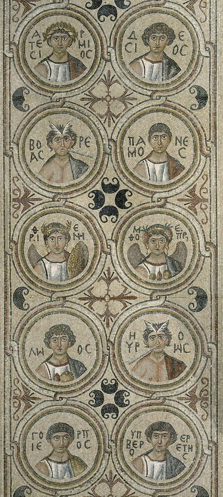 O acréscimo da figura masculina e da estrela ao lado de cada signo distingue o mosaico de Sepphoris do que é conhecido em outras sinagogas, onde apenas os doze signos do zodíaco e seus respectivos nomes estão representados (fig.4). Cada figura em Sepphoris personifica um mês do ano, um motivo recorrente na arte antiga (fig.5). As figuras em Sepphoris, como em outros lugares, são geralmente representadas sem características especiais que identifiquem os meses. É o caso, por exemplo, do mosaico de Qabr Hiram, datado de 575 d.C., onde as figuras dos meses aparecem ao lado das estações do ano (fig.6). Um paralelo próximo à nossa representação é encontrado em um relevo do final do século II ou início do I a.C., hoje embutido na Igreja de Hagios Eleutherius em Atenas, onde as personificações dos meses aparecem ao lado dos signos do zodíaco, e os trabalhos dos meses e estações do ano são exibidos ao lado deles em relevo. Esses números quase não têm características especiais que denotem a natureza de um mês específico. Podemos apenas presumir que tais modelos foram uma fonte de inspiração para nossas representações ou para as fontes iconográficas que estavam disponíveis para o artista da sinagoga que colocou o mosaico do zodíaco em Sepphoris. Este modelo hipotético foi desenhado como uma espécie de calendário contendo representações dos meses ao lado dos signos do zodíaco, com as estações do ano exibidas ao lado deles.