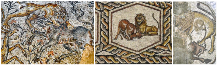 Outro edifício em Séforis conhecido como Edifício do Festival do Nilo inclui um mosaico que mostra vigorosas presas de leões e outros grupos de animais (sendo um deles um ataque ofensivo de alta qualidade – detalhe). O piso lembra um mosaico de nave mais simples na Igreja de São Jorge em Houad, na Síria. É o mosaico que ‘remete ao ataque’ de um corredor lateral que é o segundo tema da imagem (60) que mostra as garras dos leões que nessa época tinha relevância para todos os grupos de crenças. Embora não seja estritamente um mosaico do zodíaco, visto ao lado de pares repetidos de confrontos de animais no piso de São Jorge, para fins de completude, podemos colocá-los não apenas contra o chão da sinagoga de Jerasa com suas procissões de animais que representam a narrativa da Arca de Noé como na sua história bíblica característica, mas também contra o chão de Lod com sua mistura mais formalizada – quase zodiacal em seu arranjo – de ataques de animais e leões em uma estrutura geométrica. É a partir de um pequeno detalhe da tira de enquadramento neste último que ilustramos (detalhe) o único ‘ataque ofensivo’ no piso de Lod, enquanto ao lado dele está um ‘ataque ofensivo’ menos conhecido da sinagoga de Emaús – de Talgam.