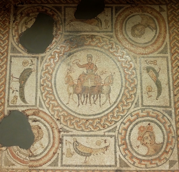 Vale lembrar que o repertório de design e conteúdo dos mosaicos romanos era uma extensão padronizada em todo o Império Romano – para comparação, veja o: ‘Mosaico do Cocheiro Vitorioso‘ da villa romana em Rudston, perto de Hull, Inglaterra, novamente apresentando as Quatro Estações de mulheres nos quatro cantos. Neste caso, o cocheiro central é simplesmente um cocheiro humano, onde outro os mosaicos da Grã-Bretanha apresentam deuses no medalhão central, como Netuno ou Vênus. Aonde em Palmira, acabamos de notar como a posição principal foi ocupada por Júpiter-Baal, nos zodíacos das sinagogas, o Deus Sol aparece como o quadrigário planetário vitorioso.